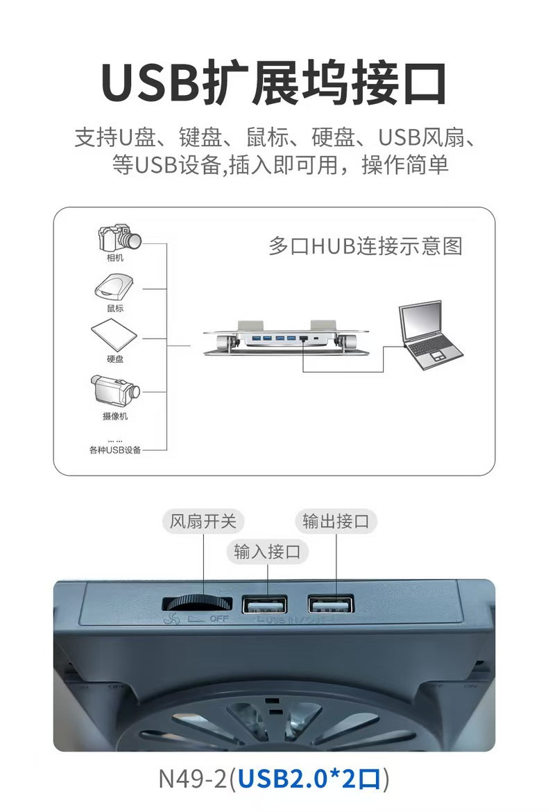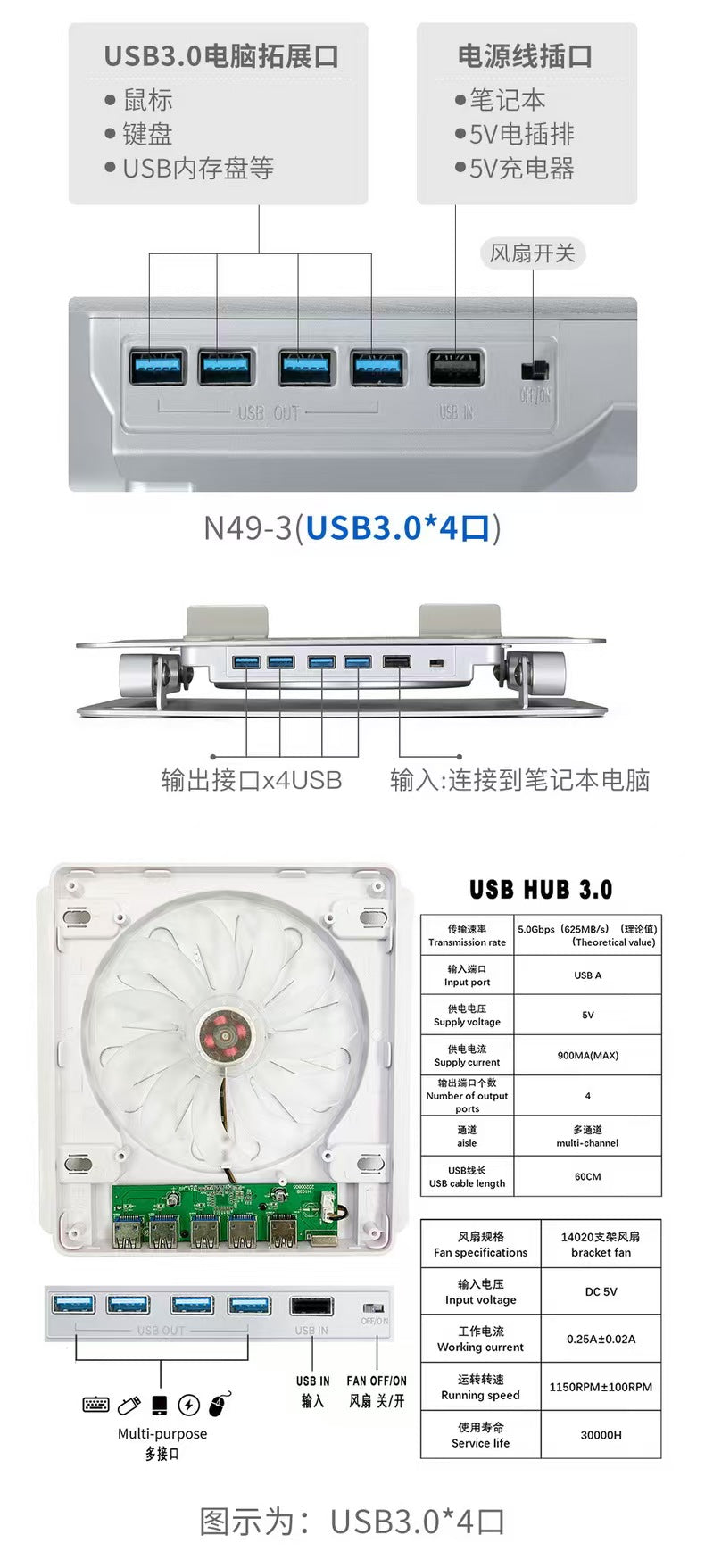 N49-1 without fan and USB, N49-2 with fan and USB2.0*2 ports, N49-3 with fan and USB 3.0*4 ports |