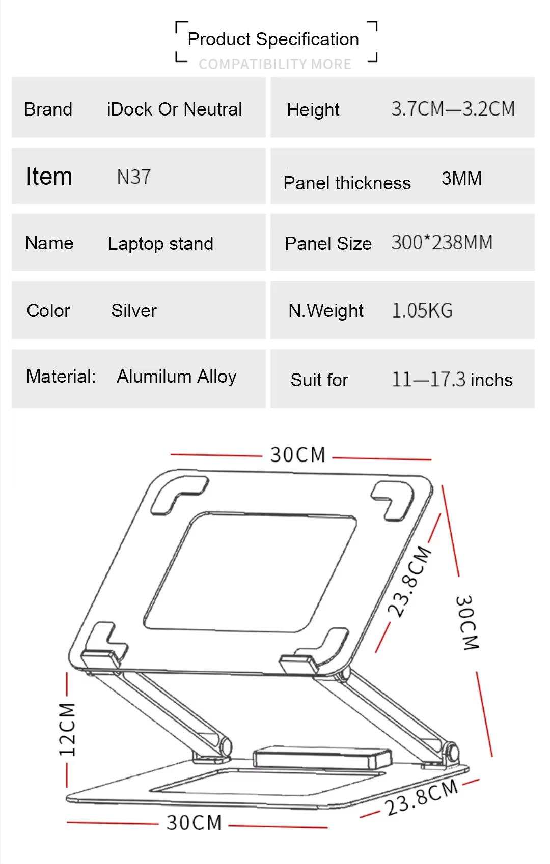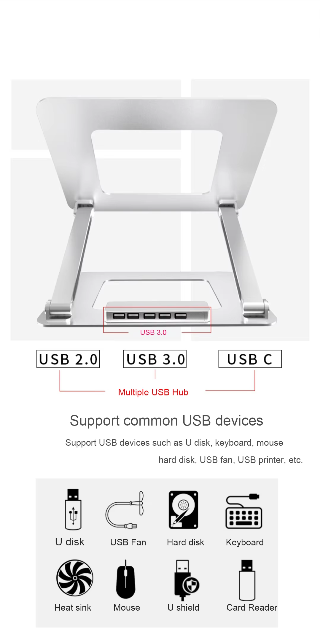 1.Product Name: iDock Ergonomic Multi-Angle Height Adjustable Heat Vent Elevate Aluminium Folding Laptop Stand with 2.0 3.0 Type C USB